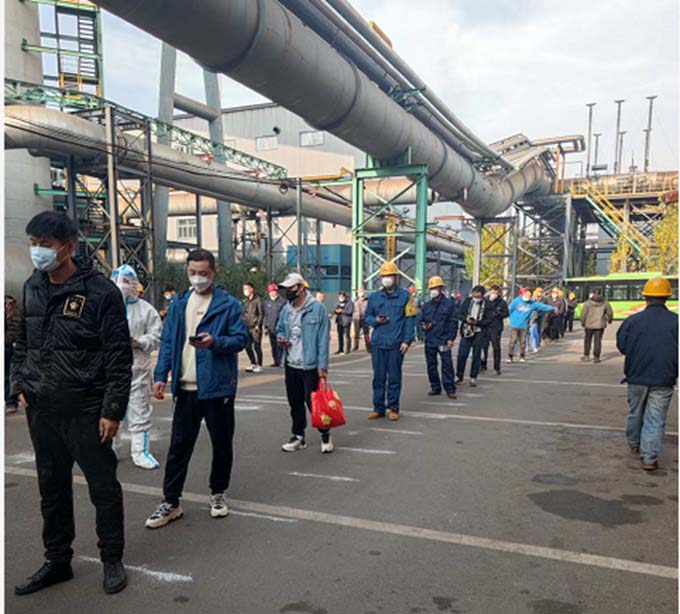 “核酸檢測人員,自覺保持2米距離、戴好口罩”10月12日上午,在公司綜合樓門前,行政處、分廠安全員、核算員積極協(xié)調(diào)核酸檢測現(xiàn)場秩序,在配合醫(yī)護人員開展檢測工作的同時,做好防疫宣傳工作。前來進行核酸檢測的職工在現(xiàn)場排起長龍,積極配合工作人員的指揮。