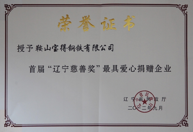 2012年9月,公司榮獲首屆“遼寧慈善獎”最具愛心捐贈企業(yè)。