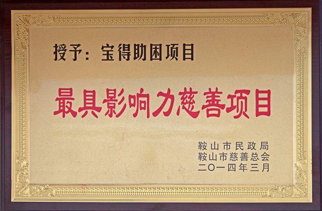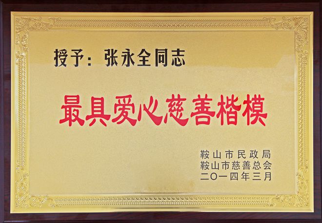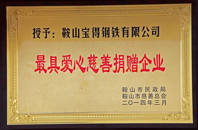 3月7日,在鞍山市慈善總會第三次會員大會上,公司榮獲“最具愛心慈善捐贈企業(yè)”、“最具影響力慈善項目”榮譽,董事長榮獲“最具愛愛心慈善楷模”榮譽稱號。