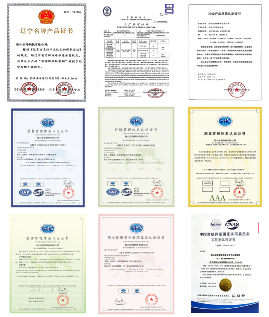 “寶得”牌鋼材以科學(xué)的管理,先進(jìn)的裝備,嚴(yán)格的檢測(cè)為保障,產(chǎn)品外型尺寸精度高,成分穩(wěn)定,性能可靠,表面質(zhì)量好,實(shí)物質(zhì)量高于國(guó)家標(biāo)準(zhǔn),達(dá)到發(fā)達(dá)國(guó)家同類產(chǎn)品水平,屢獲國(guó)家“冶金產(chǎn)品實(shí)物質(zhì)量金杯獎(jiǎng)” 和“遼寧省名牌產(chǎn)品”稱號(hào)。公司通過了GB/T 19001/ISO 9001質(zhì)量管理體系、GB/T 24001/ ISO 14001環(huán)境管理體系、GB/T 45001/ISO 45001職業(yè)健康安全管理體系、GB/T 23331 / ISO 50001和RB/T 103能源管理體系、GB/T 19022/ISO 10012測(cè)量管理體系審核認(rèn)證,獲得方圓標(biāo)志認(rèn)證中心頒發(fā)的“管理創(chuàng)新獎(jiǎng)”,取得國(guó)家船級(jí)社(CCS)的生產(chǎn)工廠認(rèn)可證書和遼寧省進(jìn)出口檢驗(yàn)檢疫局頒發(fā)的“產(chǎn)品出口免檢認(rèn)可證書”。